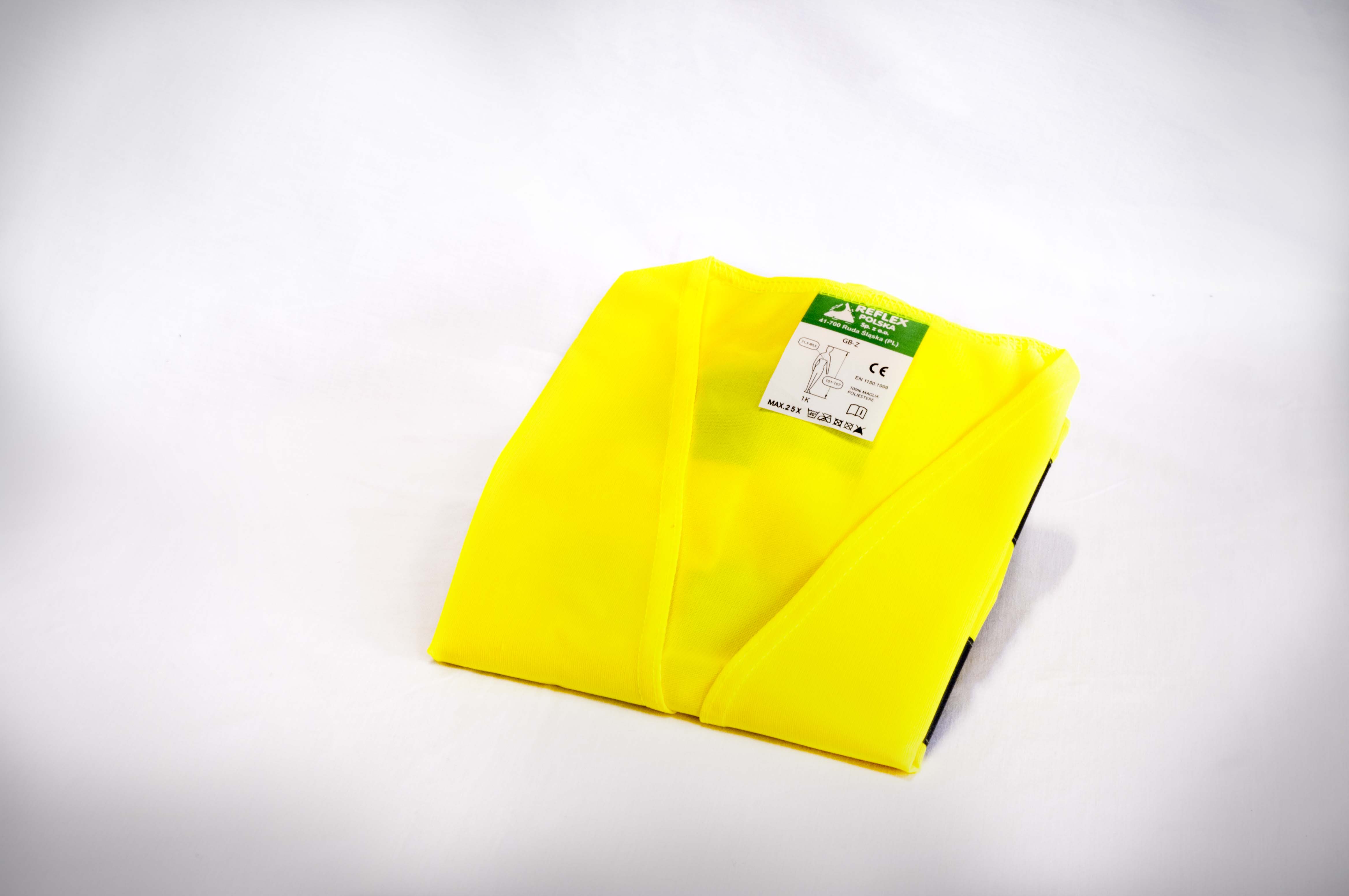 Gilet di segnalazione certificato CE secondo la normativa EN 471/2003 richiuso in busta, facille da estrarre in caso di emergenza.
